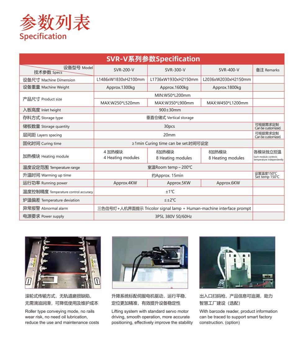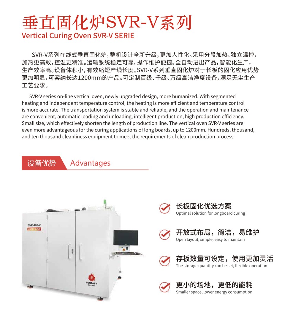SVR-V系列在線式垂直固化爐,整機設計全新升級,更加人性化。采用分段加熱、獨立溫控,加熱更高效,控溫更精準。運輸系統穩定可靠,操作維護便捷。全自動進出產品,智能化生產,生產效率高。設備體積小,有效縮短產線長度。SVR-V系列垂直固化爐對于長板的固化應用優勢更加明顯,可容納長達1200mm的產品??啥ㄖ瓢偌墶⑶Ъ?、萬級高潔凈度設備,滿足無塵生產工藝要求。