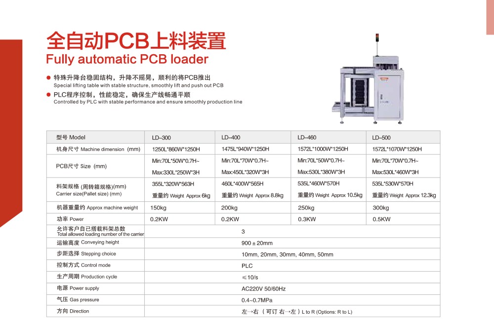 全自動PCB上料機介紹:特殊升降臺穩(wěn)固結構,升降不搖晃,順利的將PCB推出;PLC程序控制,性能穩(wěn)定,確保生產(chǎn)線暢通平順;