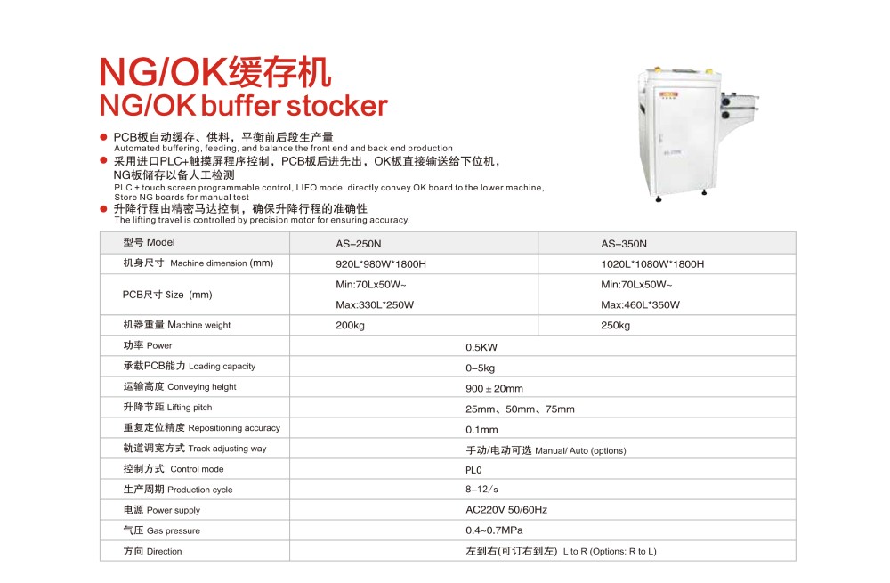 NG/OK緩存機(jī)介紹:PCB板自動(dòng)緩存、供料,平衡前后段生產(chǎn)量;采用進(jìn)口PLC+觸摸屏程序控制,PCB板后進(jìn)先出,OK板直接輸送給下位機(jī),NG板儲(chǔ)存以備人工檢測(cè);升降行程由精密馬達(dá)控制,確保升降行程的準(zhǔn)確性;