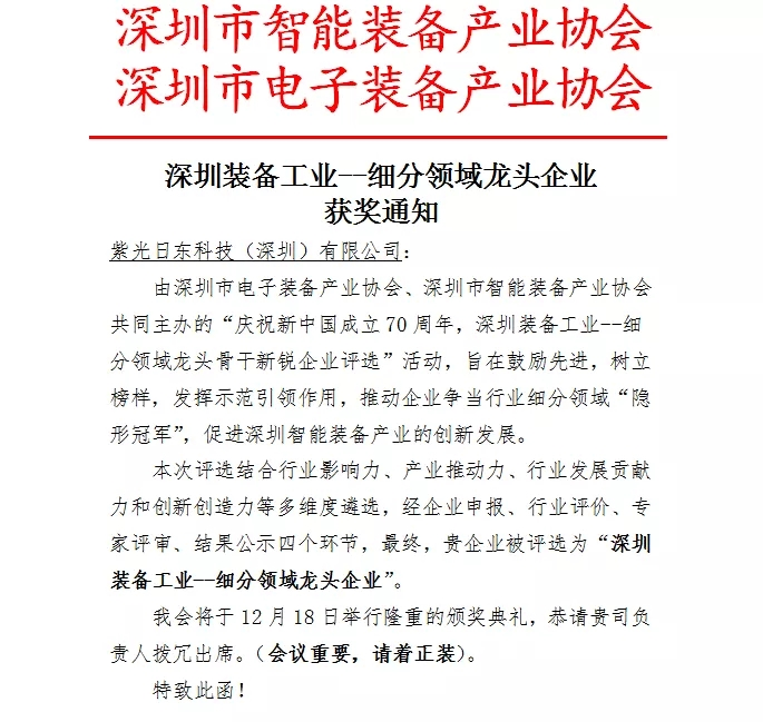 2019年12月18日,由深圳市電子裝備產(chǎn)業(yè)協(xié)會(huì)、深圳市智能裝備產(chǎn)業(yè)協(xié)會(huì)主辦的“深圳裝備工業(yè)—細(xì)分領(lǐng)域龍頭骨干新銳企業(yè)”評(píng)選活動(dòng),在深圳市福田區(qū)會(huì)展中心舉行盛大的頒獎(jiǎng)典禮,經(jīng)過組委會(huì)的層層篩選,日東科技在本次評(píng)選中獲得了細(xì)分領(lǐng)域”龍頭企業(yè)“的殊榮!