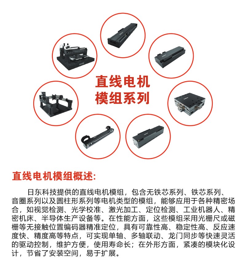 日東科技自主研發(fā)的直線電機產(chǎn)品系列,集高精度(100納米重復(fù)定位精度)、高響應(yīng)速度、高穩(wěn)定性及可靠性等優(yōu)點,廣泛應(yīng)用于各行業(yè)精密場合,如視覺檢測、光學(xué)校準(zhǔn)對位、激光加工、工業(yè)機器人、精密機床等。產(chǎn)品采用光柵尺或磁柵等無接觸位置編碼器精準(zhǔn)定位,可實現(xiàn)單軸、多軸聯(lián)動,龍門同步等快速靈活的驅(qū)動控制,維護方便,使用壽命長,同時緊湊的模塊化設(shè)計節(jié)省了安裝空間,易于擴展。